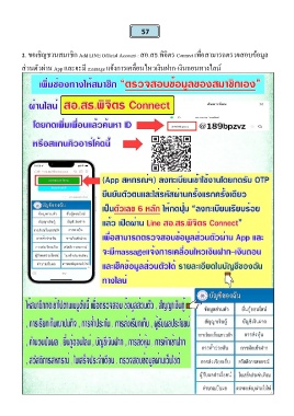 57 2. ขอเชิญชวนสมาชิก Add LINE Official Account : สอ.สธ.พิจิตร Connect เพื่อสามารถตรวจสอบข้อมูล ส่วนตัวผ่าน App และจะมี massage แจ้งการเคลื่อนไหวเงินฝาก-เงินถอนทางไลน์