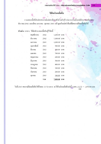 ในป 2563 สหกรณคิดเฉลยคืนให้รอยละ 13.72 นาย ก. จะได้รบเงนเฉลยคืนดังน้ 7,800 x 13.72 = 1,070.00 บาท