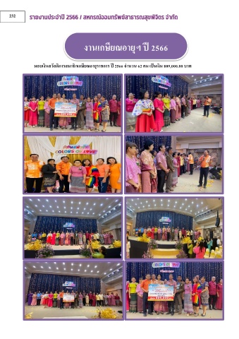 232 งานเกษยณอายุฯ ป 2566 ี ี ิ ิ ิ มอบเงนสวัสดิการสมาชกเกษียณอายุราชการ ป 2566 จ านวน 62 คน เปนเงน 809,000.00 บาท ็ ี