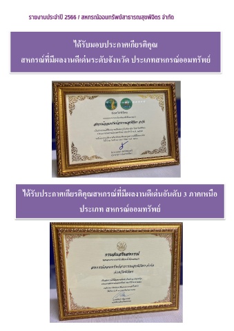 ไดรบมอบประกาศเกียรตคุณ ้ ั ิ สหกรณที่มีผลงานดีเดนระดับจังหวัด ประเภทสหกรณออมทรพย์ ่ ั ์ ์ ี ้ ื ไดรบประกาศเกียรตคุณสหกรณทมผลงานดีเดนอันดับ 3 ภาคเหนอ ่ ี ่ ิ ั ์ ประเภท สหกรณออมทรพย ั ์ ์